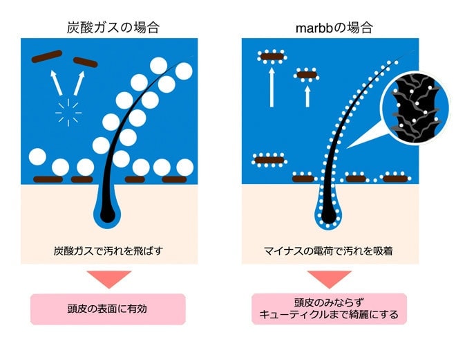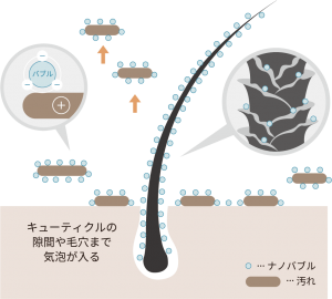 超微細気泡だからこそ、キューティクルの隙間や毛穴に入り込み、通常のシャンプーでは落ちにくい、皮脂汚れや残留シャンプーを除去できます。